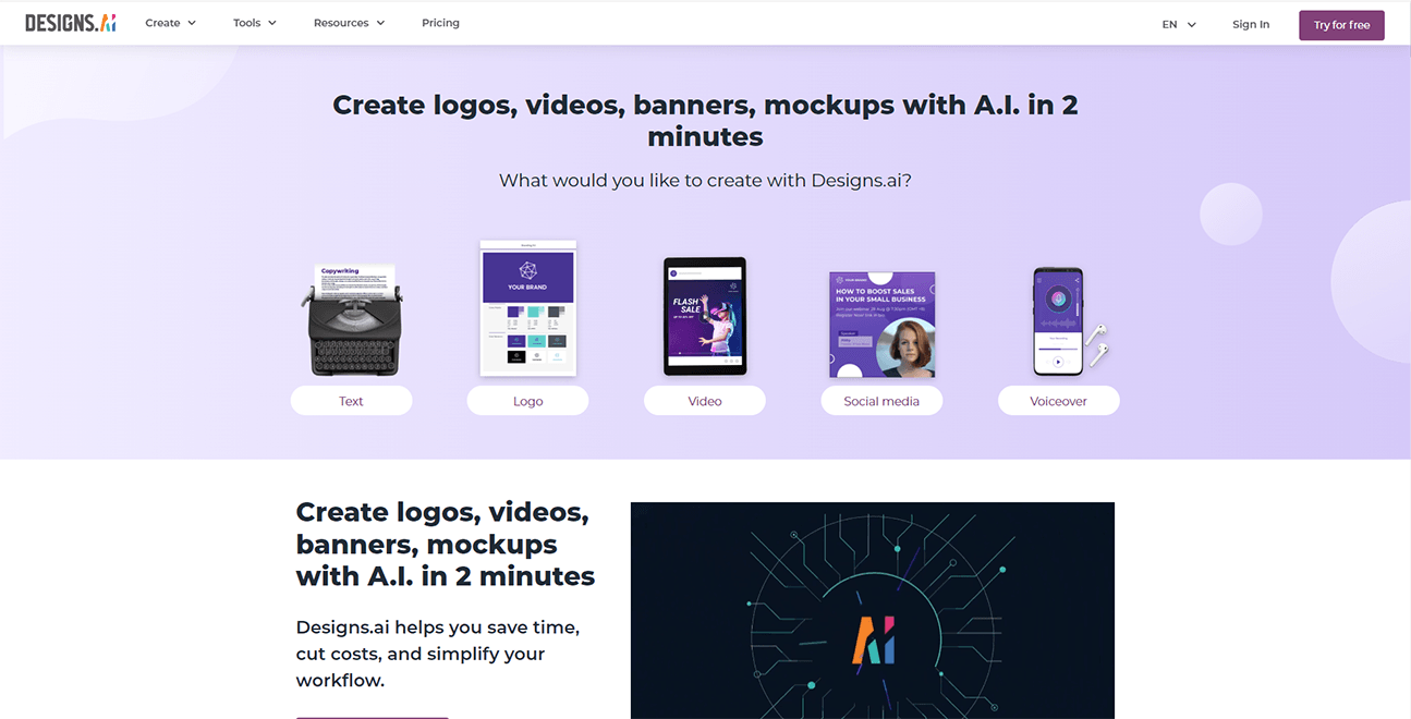 Designs AI – это современный инструмент для создания графического контента с помощью искусственного интеллекта. Вы сможете создать уникальные логотипы, баннеры, макеты и видеоролики за считанные минуты. Благодаря designs.ai вы не только сэкономите время, но и существенно упростите процесс создания различной графики, так как AI инструмент позволяет создавать работы на профессиональном уровне всего в несколько кликов мышкой. Помимо графики Designs AI поддерживает работу с голосом.