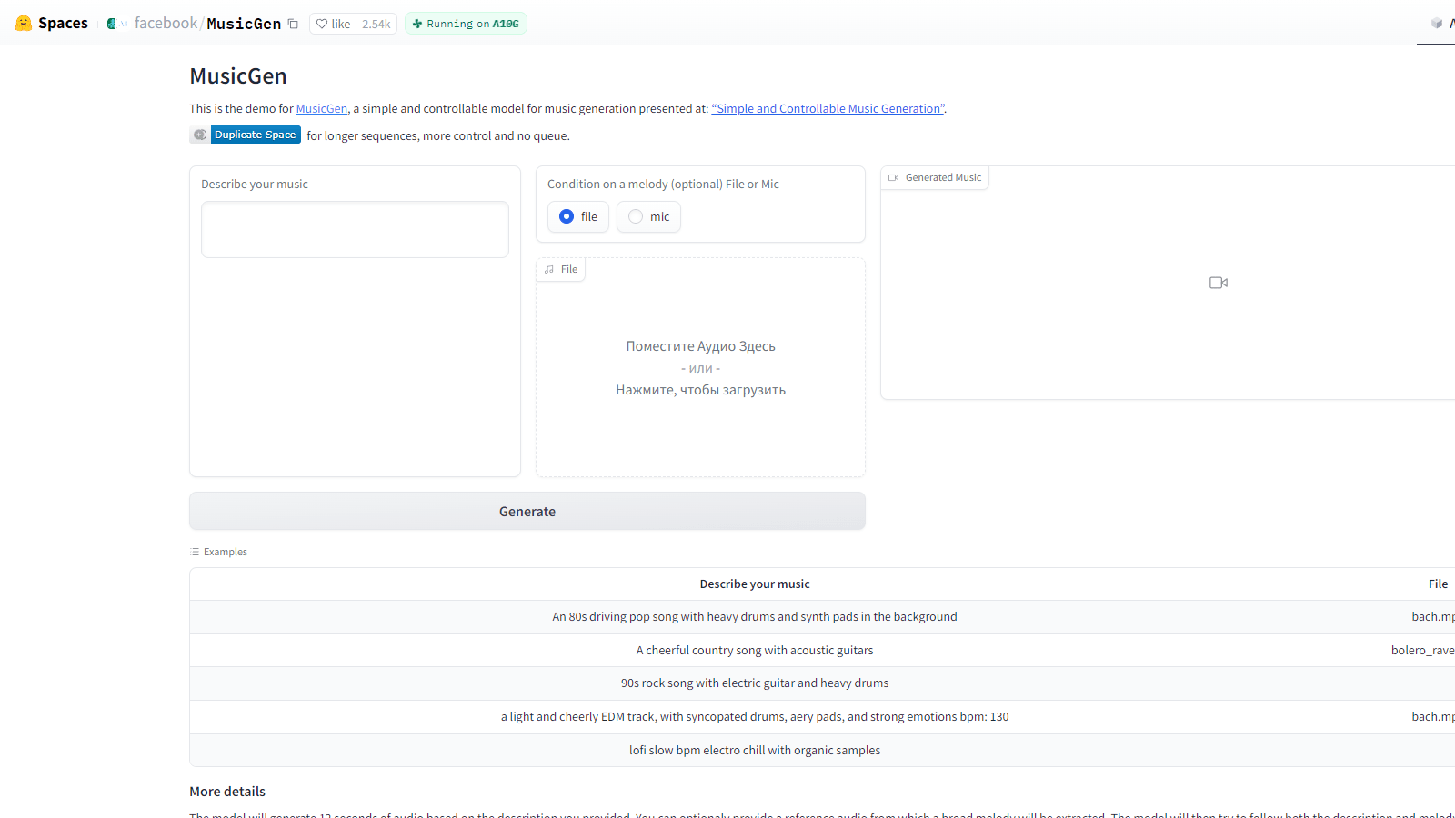 MusicGen – бесплатный ИИ генератор музыки по текстовому описанию. MusicGen позволяет создать музыку или звуковой файл продолжительностью не более 12 секунд. ИИ работает как на базе текстового описания, так и на базе “примеров” – то есть вы можете одновременно описать текстом, что хотите получить, а также загрузить в нейросеть существующий аудиофайл, на базе чего нейросеть создаст абсолютно новый аудио-файл с учетом вашего описания и примера.