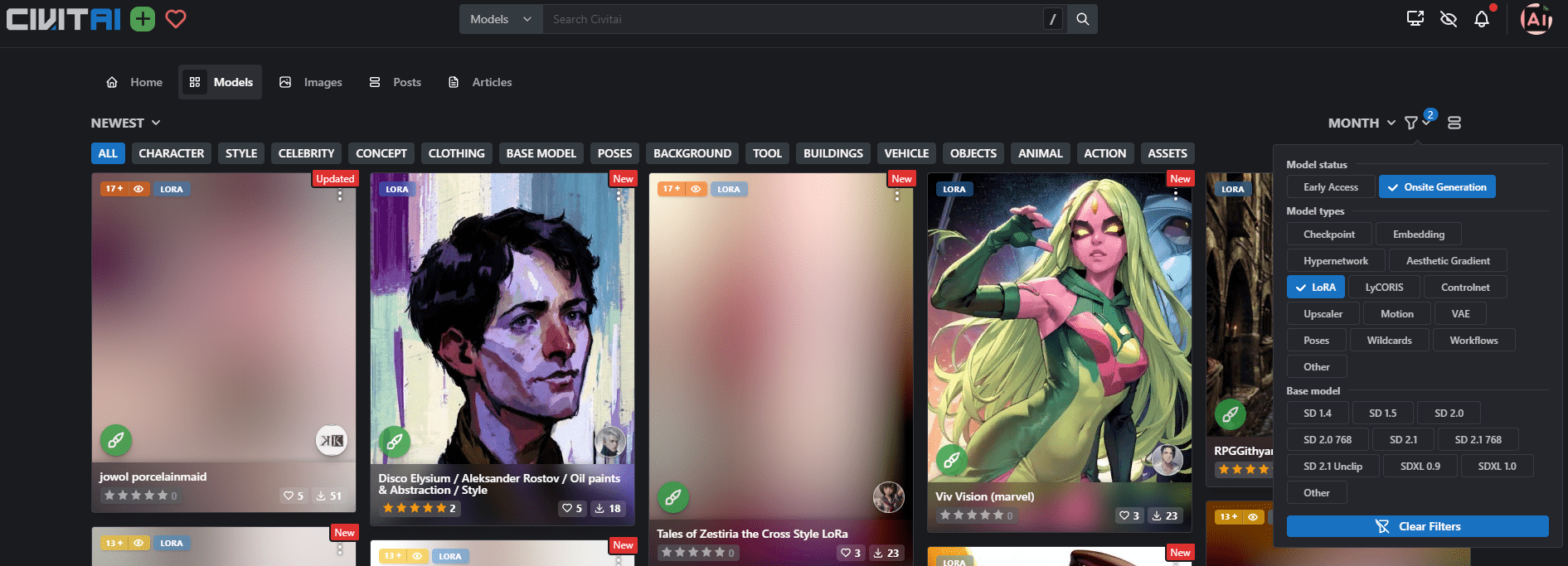Для нахождения моделей контрольных точек можно зайти на сайт Civit AI и выбрать необходимую версию для создания желаемых изображений. Они бывают в разных конфигурациях и стилях, дают уникальный результат. Предусмотрены универсальные варианты и узкоспециализированные направления.