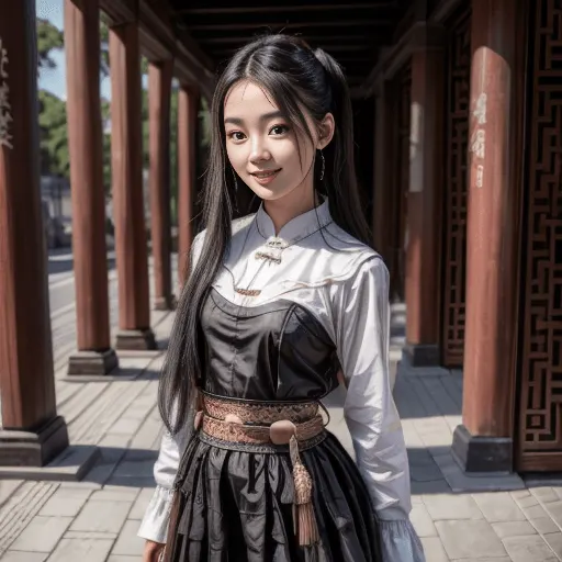 realistic, photorealistic, masterpiece, best quality, 1girl, solo, smile, looking at viewer, long black hair, cowboy shot, cns_dress, pettiskirt, standing, (china jiangnan water town style:1.1), beautiful sky, netural lighting, <lora:cns_dress_style3_v2:1>
