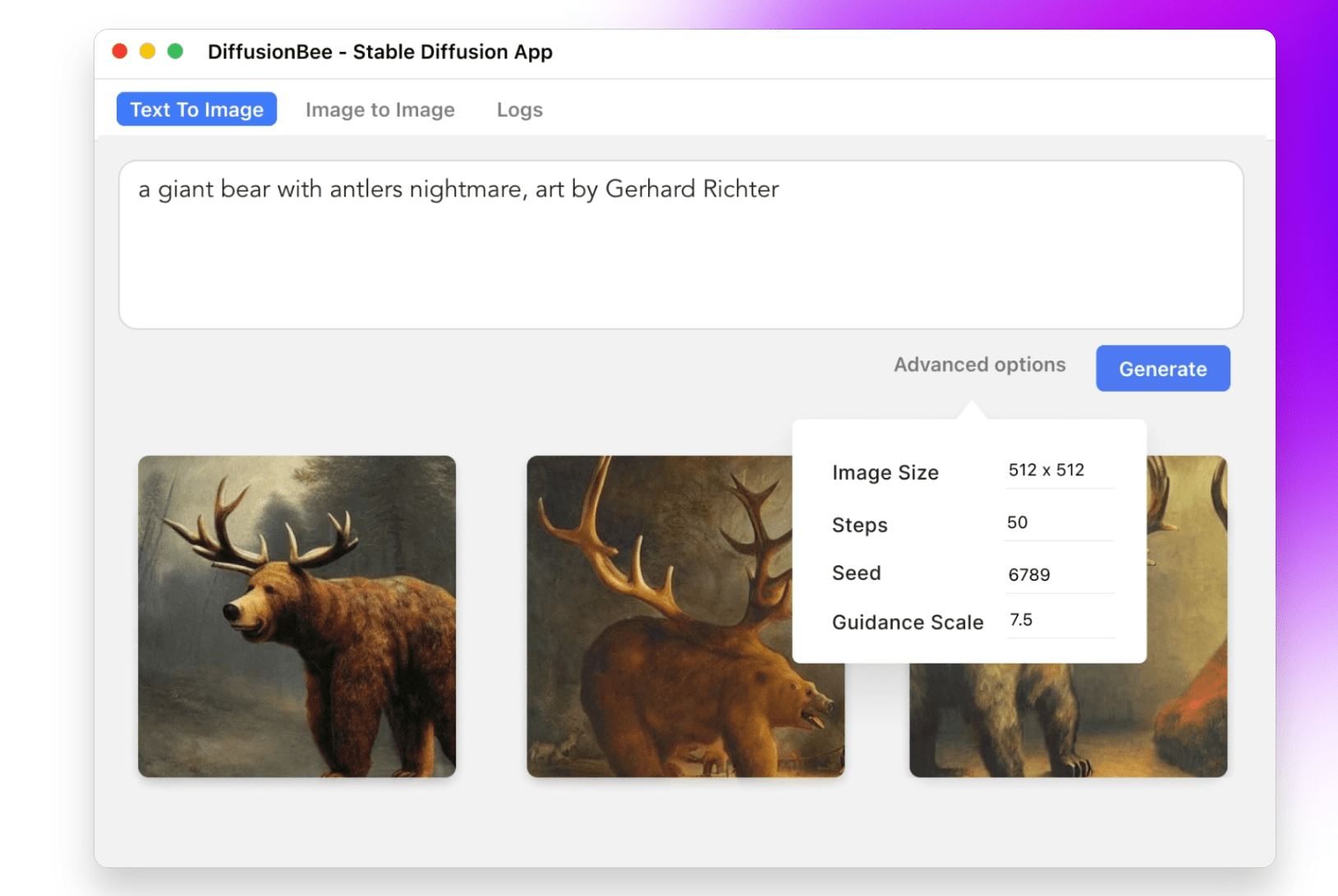 DiffusionBee – бесплатный установщик нейросети SD для всех macOS устройств. Позволяет безлимитно генерировать изображения с помощью Stable Diffusion в рамках лицензии CreativeML Open RAIL-M. Ограничения и процесс установки схож с предыдущим Windows клиентом, отличается лишь формат файла: