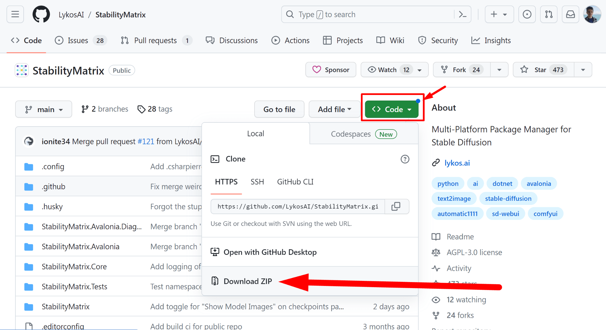 Скачать Stable Diffusion для полной установки можно по этой ссылке. Чтобы загрузить все установочные файлы раскройте поле “<> Code” и выберите пункт Download ZIP: