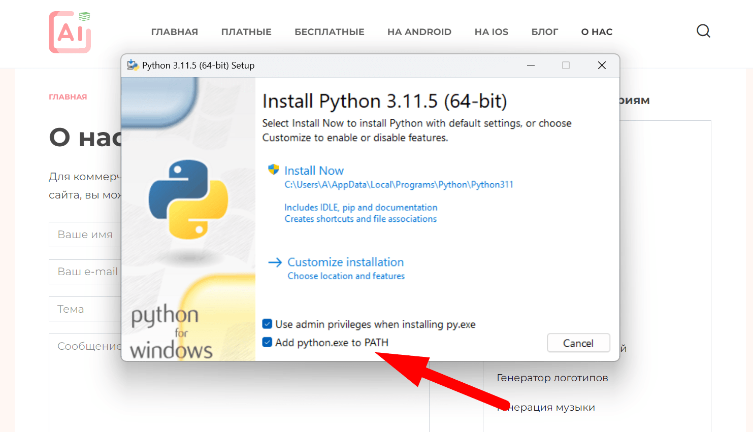 Важно: по умолчанию у пункта “Add python.ext to PATH” нет галочки, установите её самостоятельно при установке.