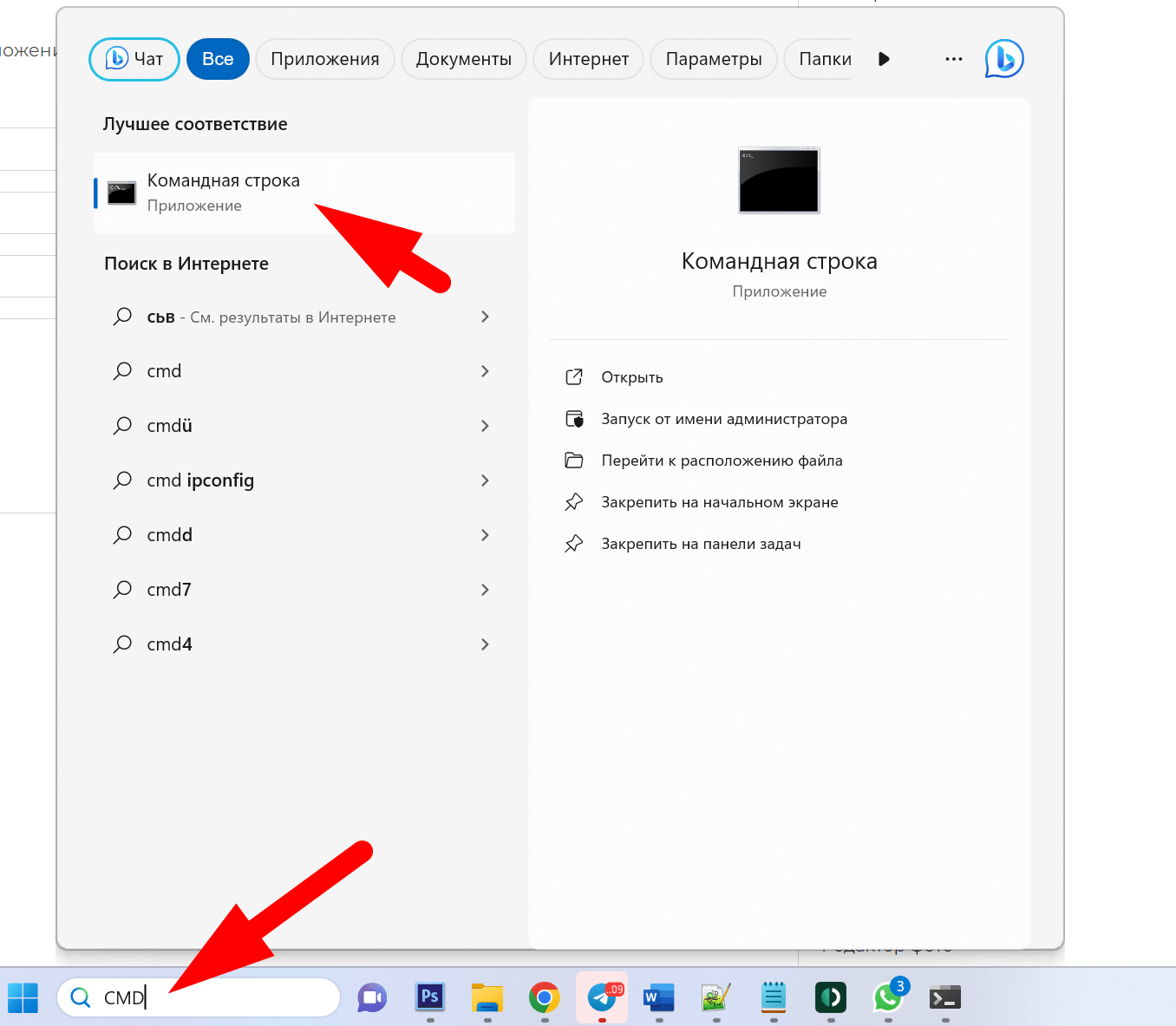 В поиске на вашем компьютере задайте “CMD” и выберите “Командная строка”:
