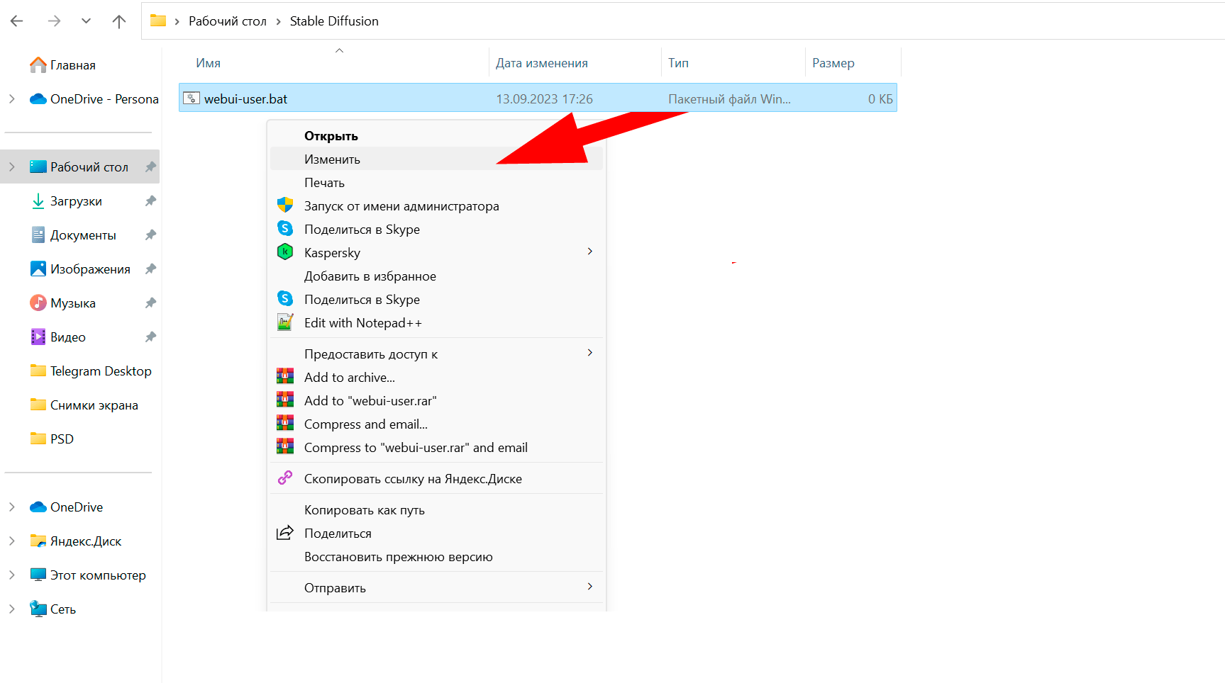 webui-user.batправой кнопкой мыши и в выпадающем меню выберите пункт “Изменить”.